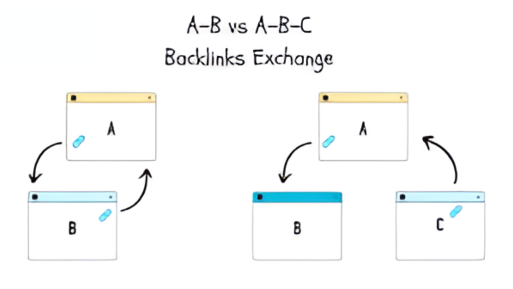 While many websites use reciprocal links to exchange backlinks, direct swaps can sometimes appear unnatural. That’s why many SEO professionals prefer an ABC link exchange, also known as a three-way link exchange.