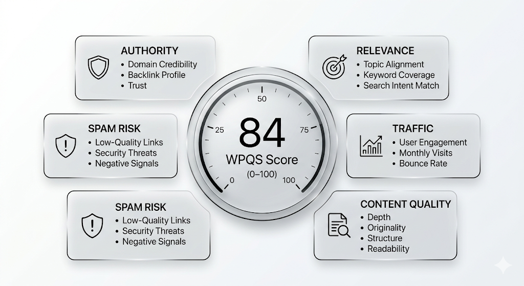 WPQS is a 0 – 100 scoring model that helps you quickly decide whether a website is worth pitching for backlinks based on authority, relevance, traffic, content quality, and spam risk.