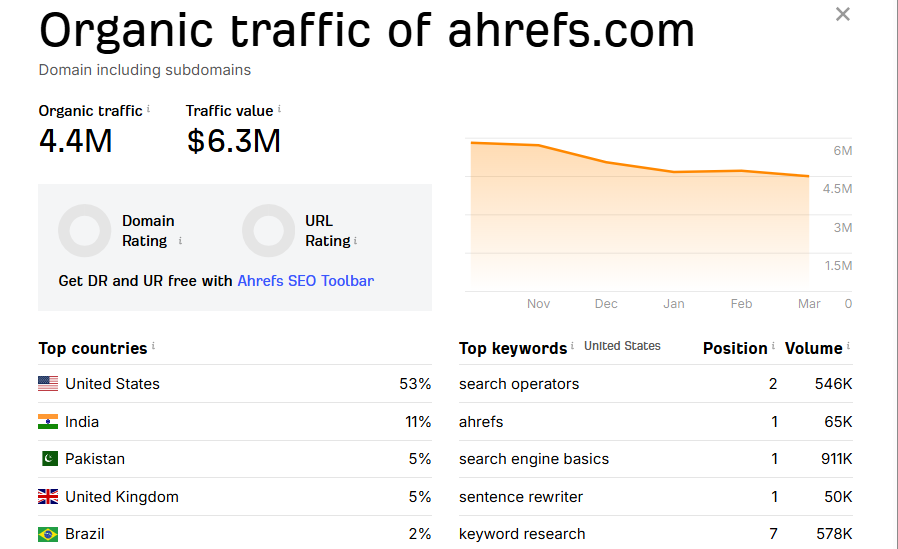 - You can use Ahrefs or Semrush to analyze a website’s organic traffic, keyword rankings, and overall traffic quality.